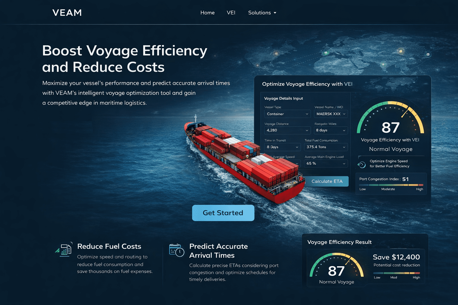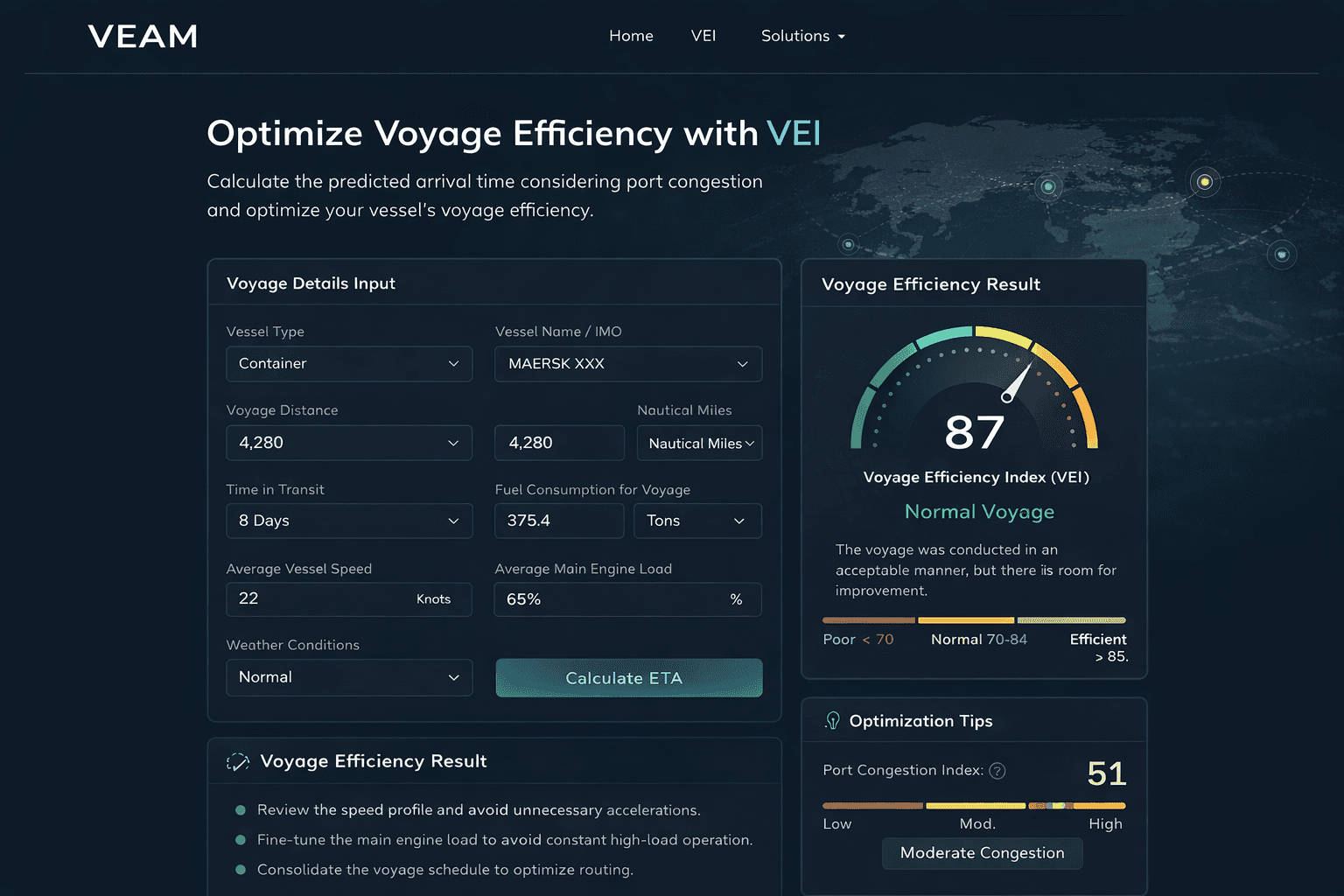 VEAM (Voyage Efficiency & Arrival Model) is a program that helps to calculate the actual time of arrival of a vessel at the port (ETA) and assess the efficiency of the voyage, taking into account the operating conditions and port load.